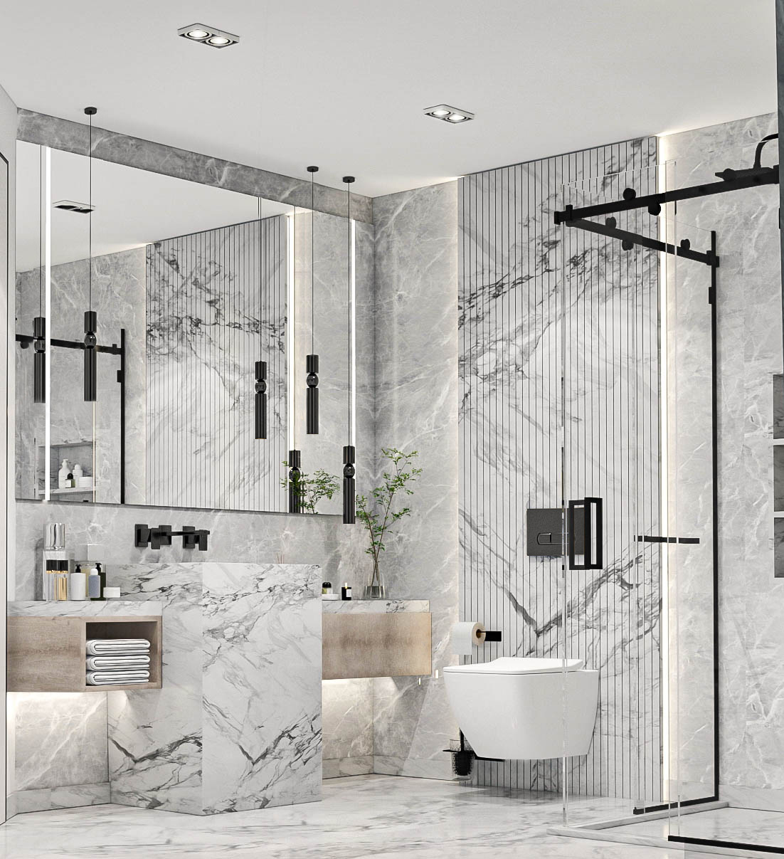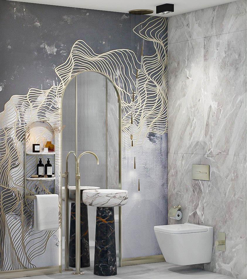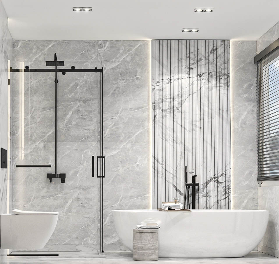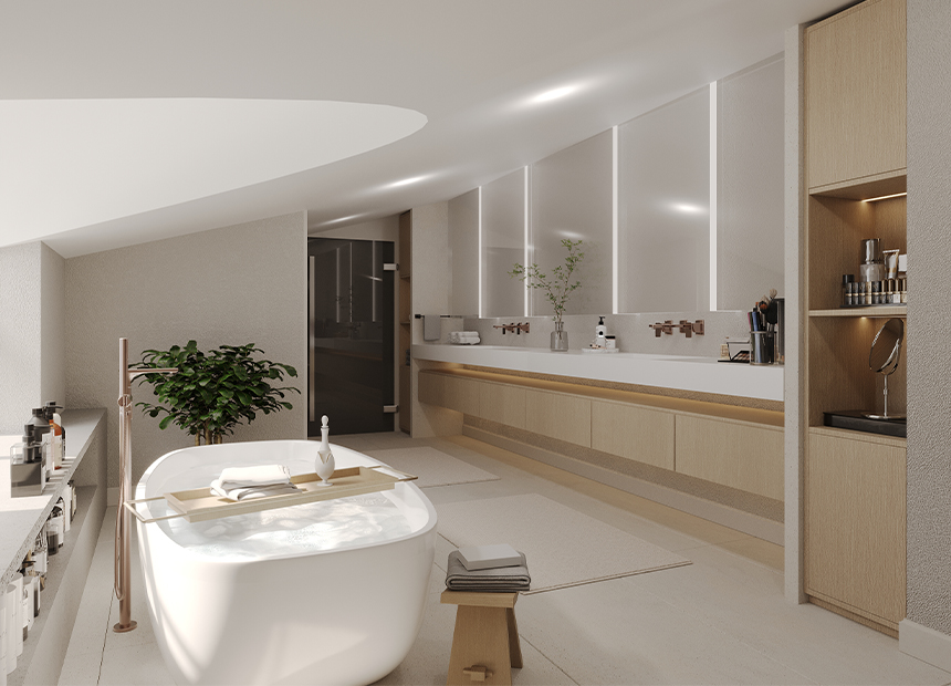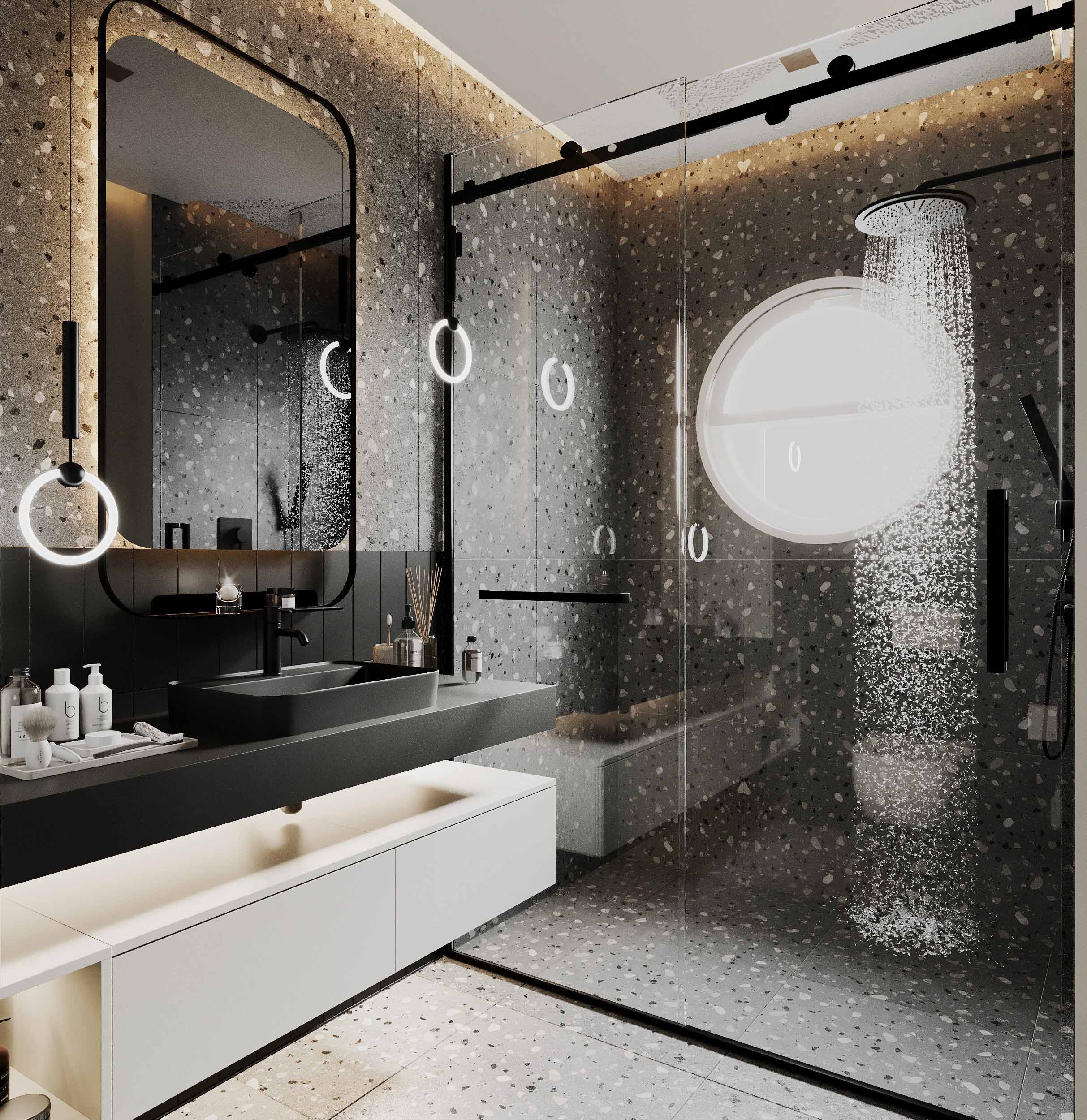 Duş ve küvet düzenlemesi, banyonun merkezinde yer alır. Duşakabin veya serbest duran küvet gibi seçenekler, banyonun kullanımını çeşitlendirir. Cam bölmeler, alanı daha geniş gösterirken aynı zamanda şeffaflığı korur.