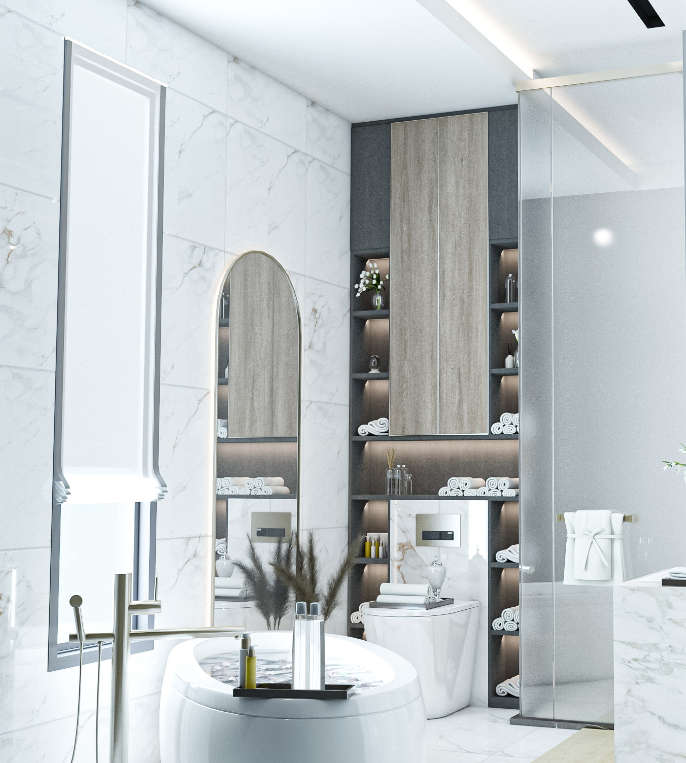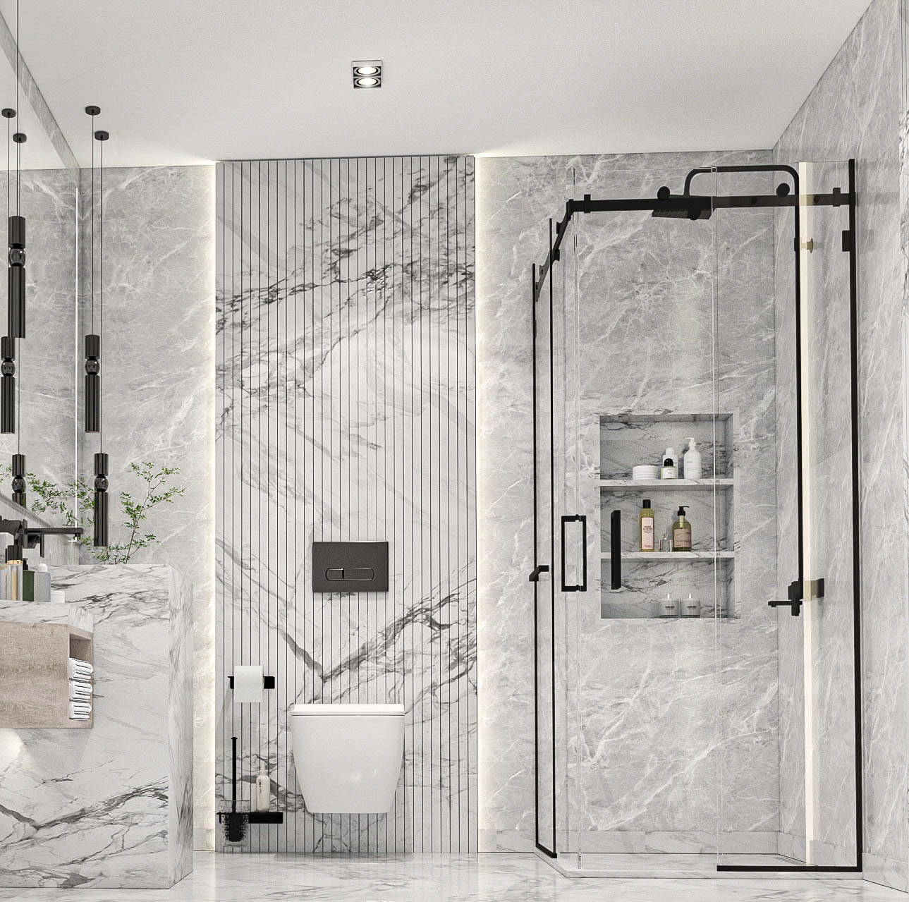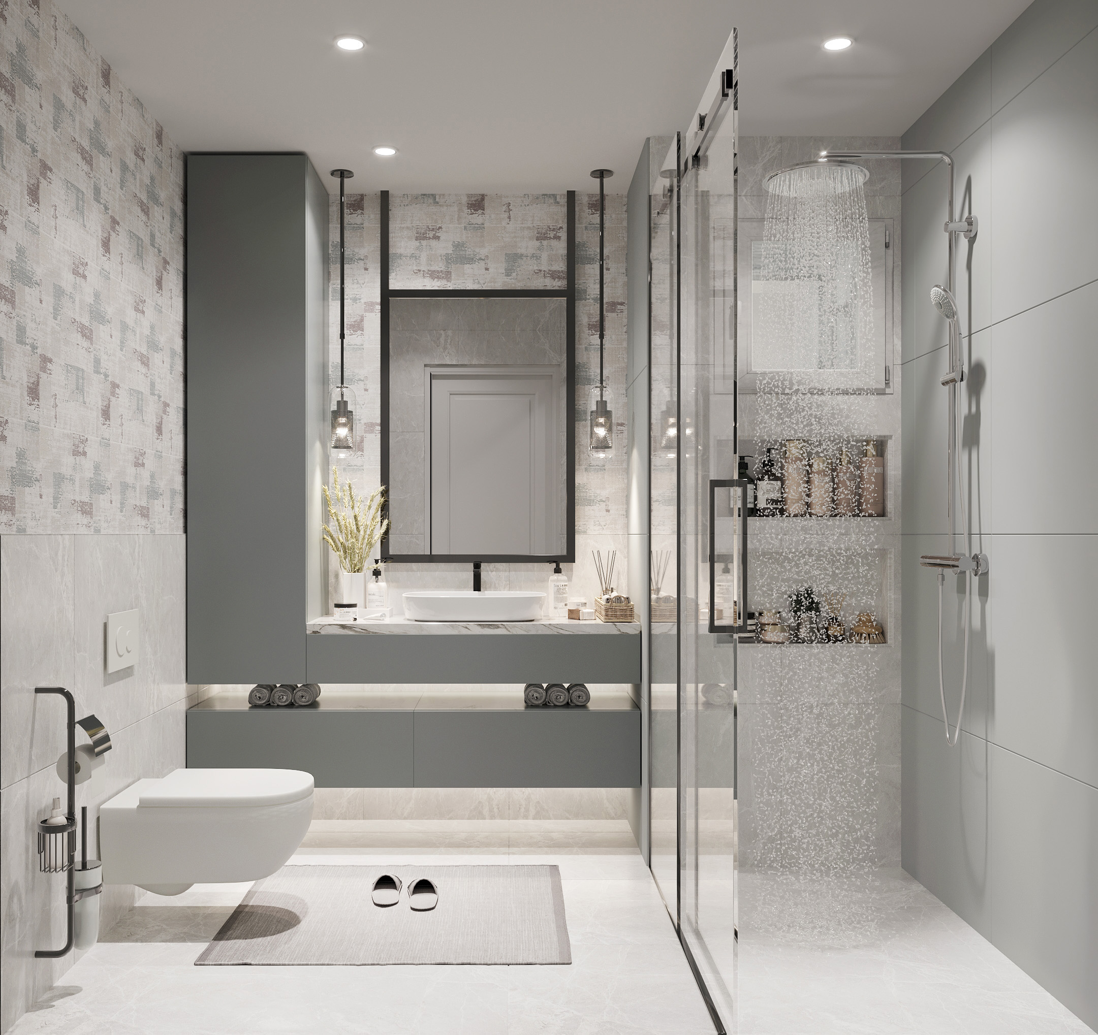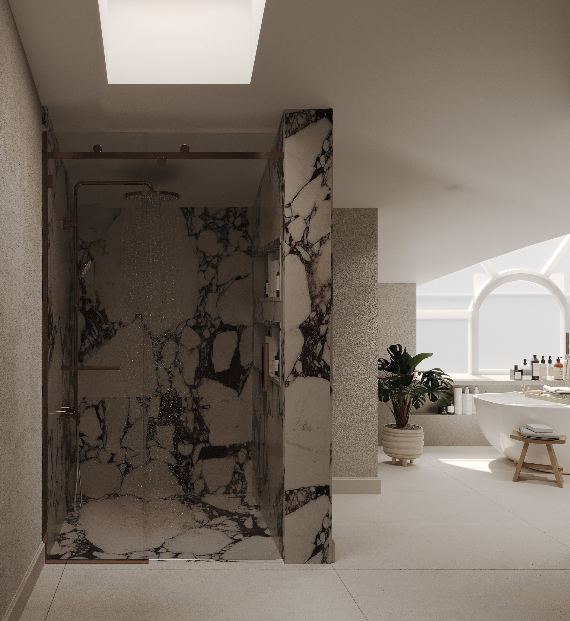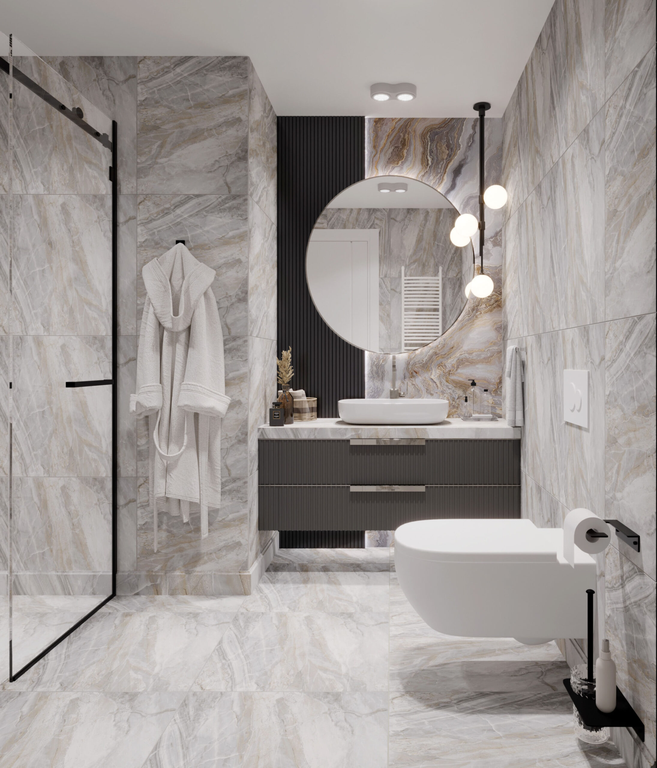 Duş ve küvet düzenlemesi, banyonun merkezinde yer alır. Duşakabin veya serbest duran küvet gibi seçenekler, banyonun kullanımını çeşitlendirir. Cam bölmeler, alanı daha geniş gösterirken aynı zamanda şeffaflığı korur.