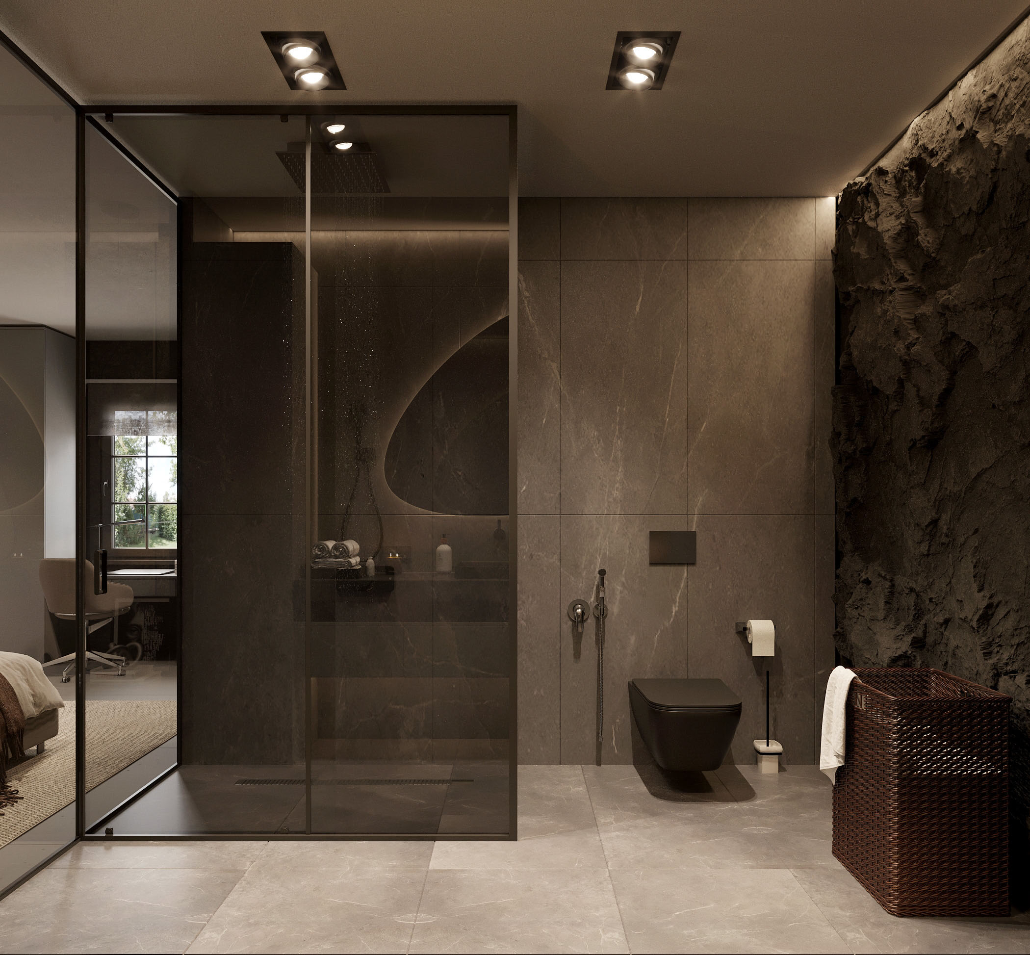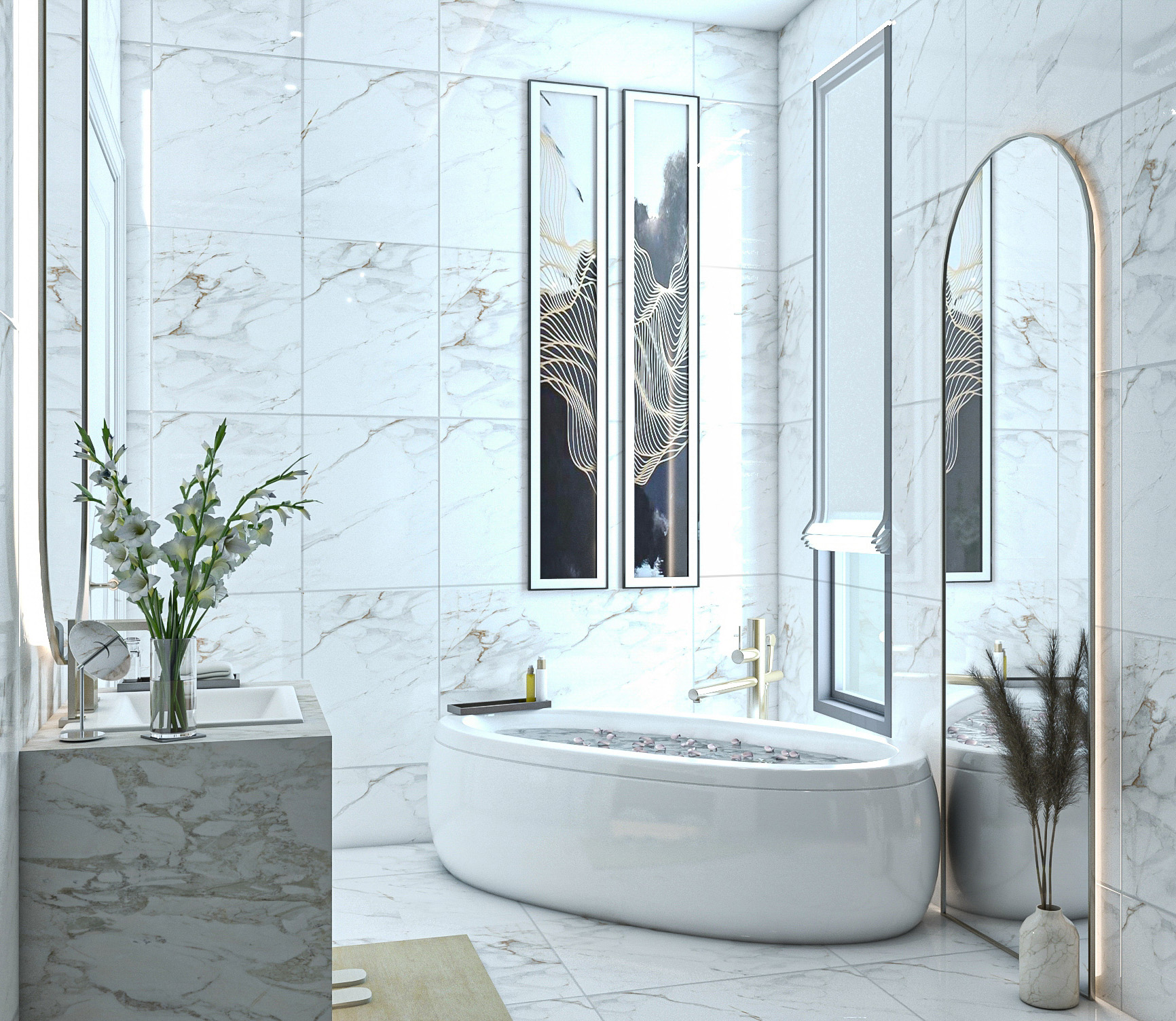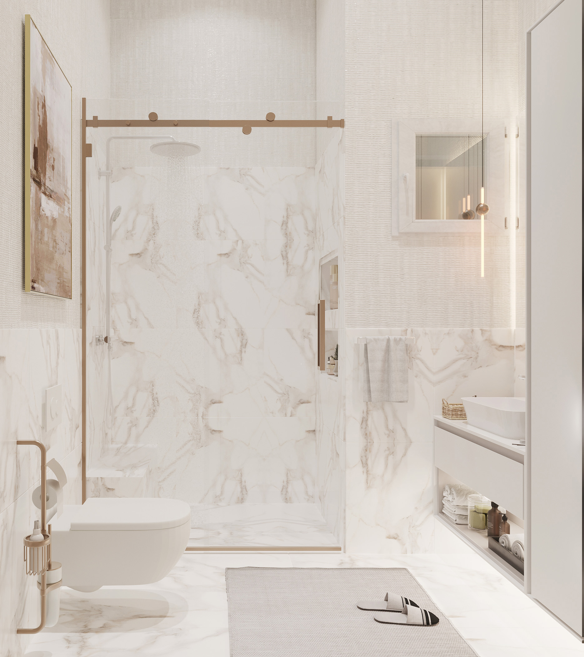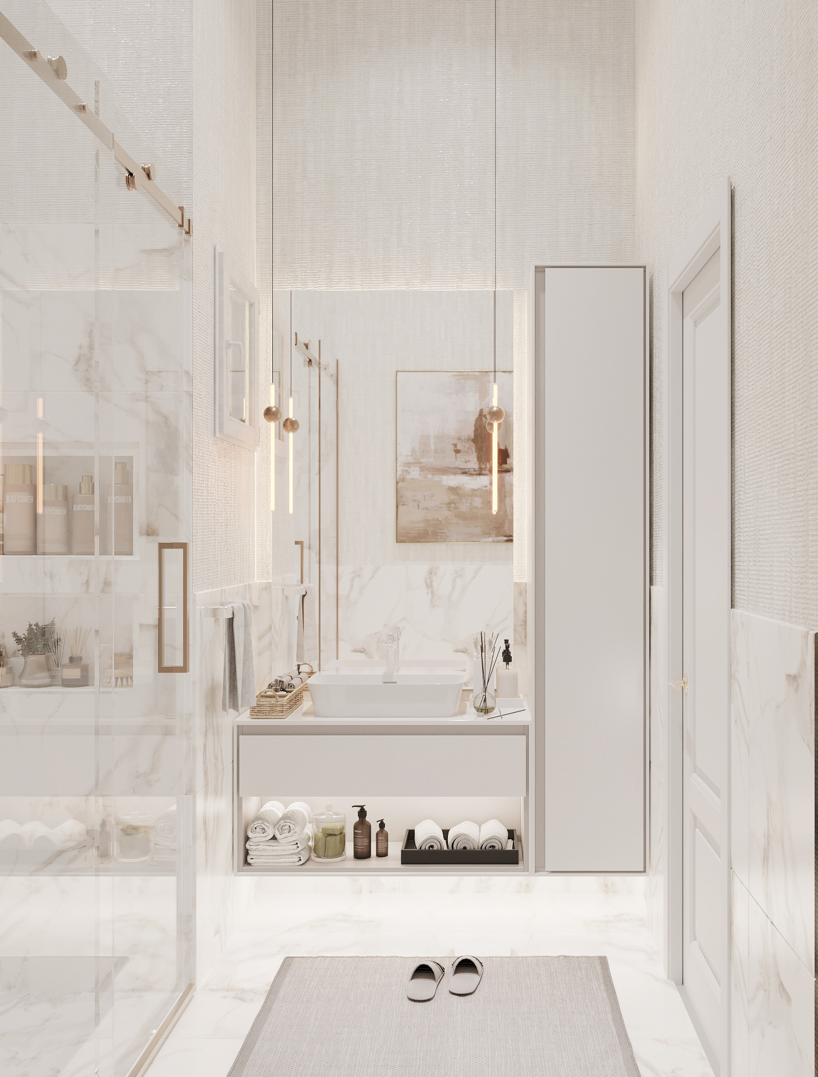 Duş ve küvet düzenlemesi, banyonun merkezinde yer alır. Duşakabin veya serbest duran küvet gibi seçenekler, banyonun kullanımını çeşitlendirir. Cam bölmeler, alanı daha geniş gösterirken aynı zamanda şeffaflığı korur.
