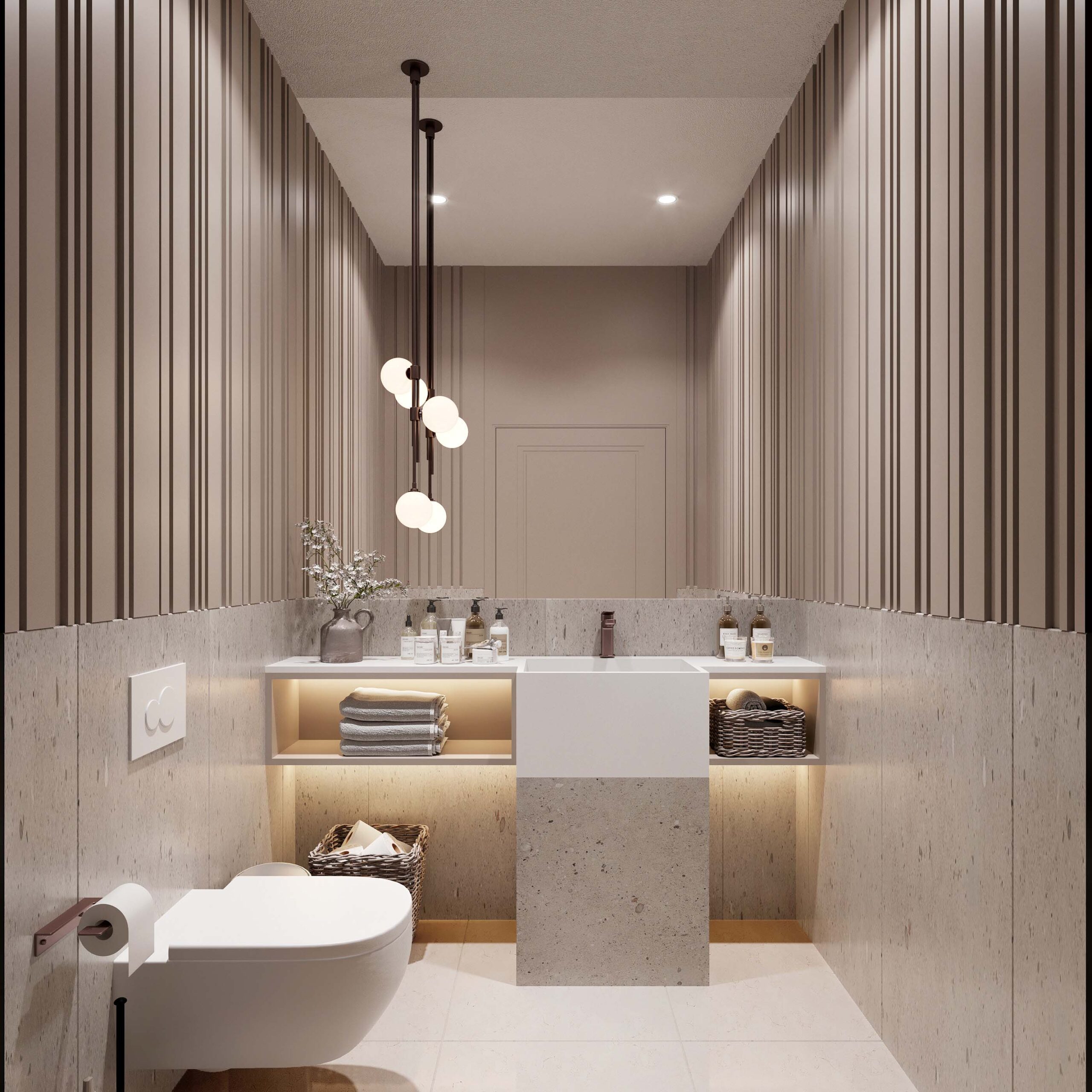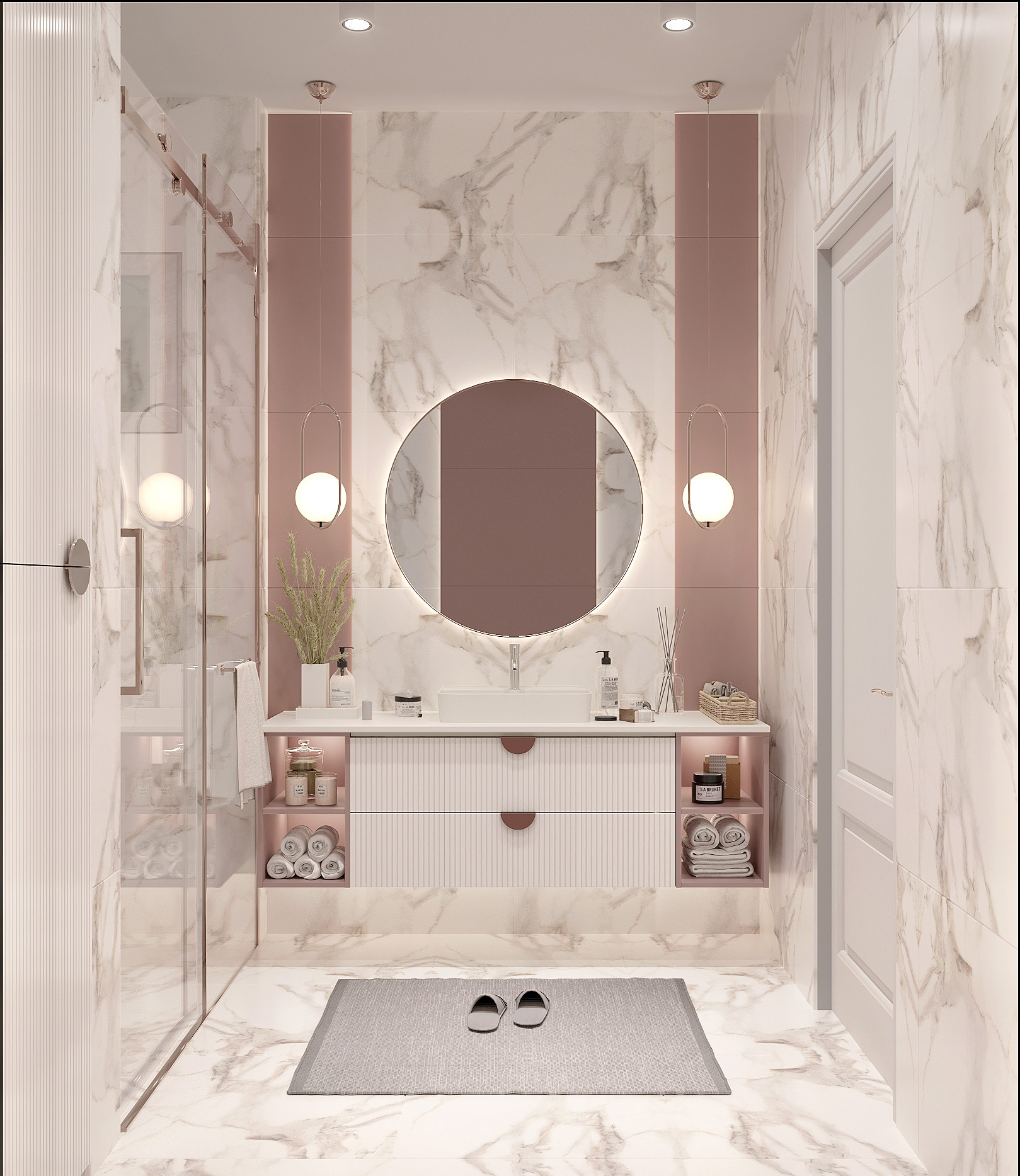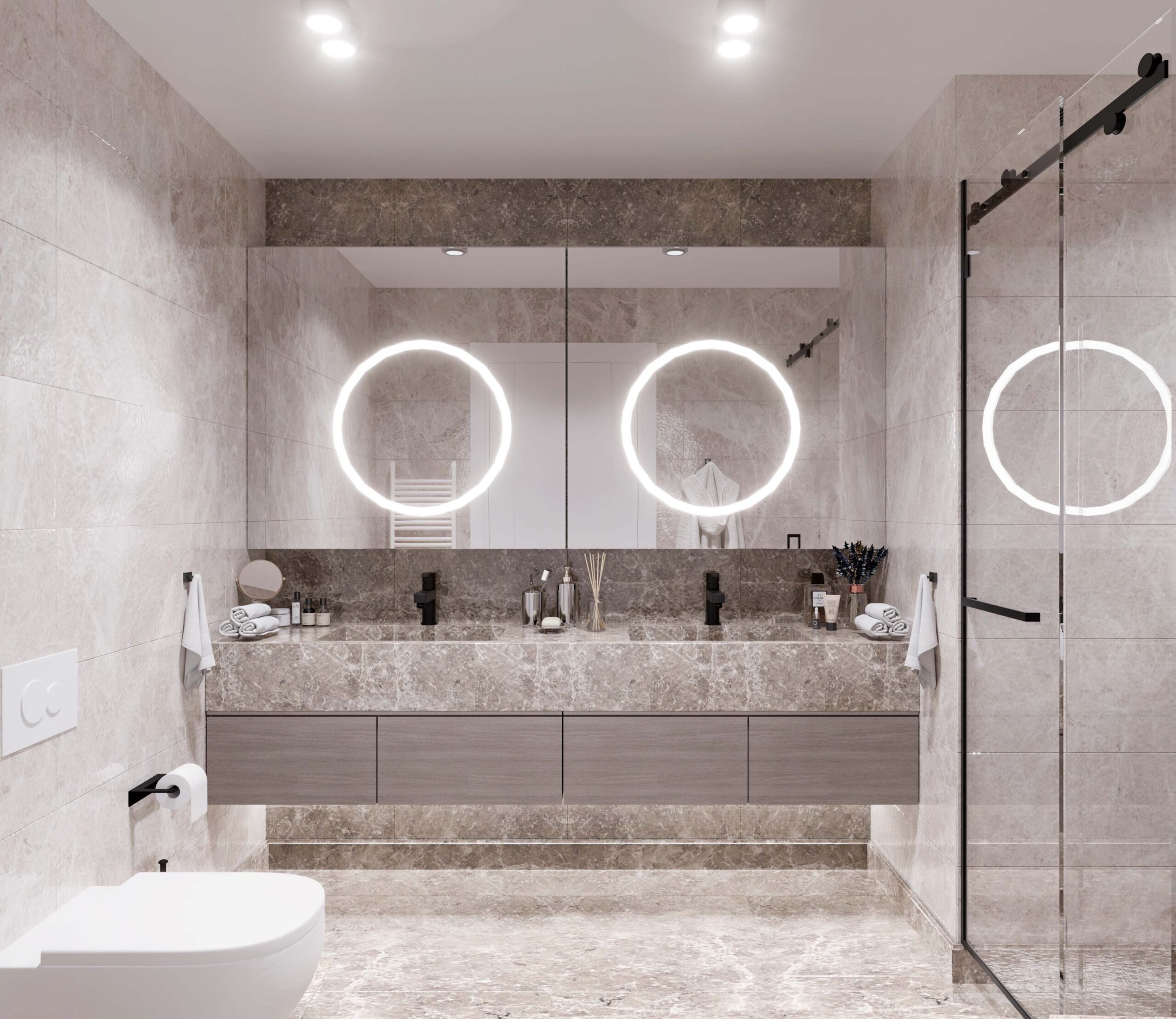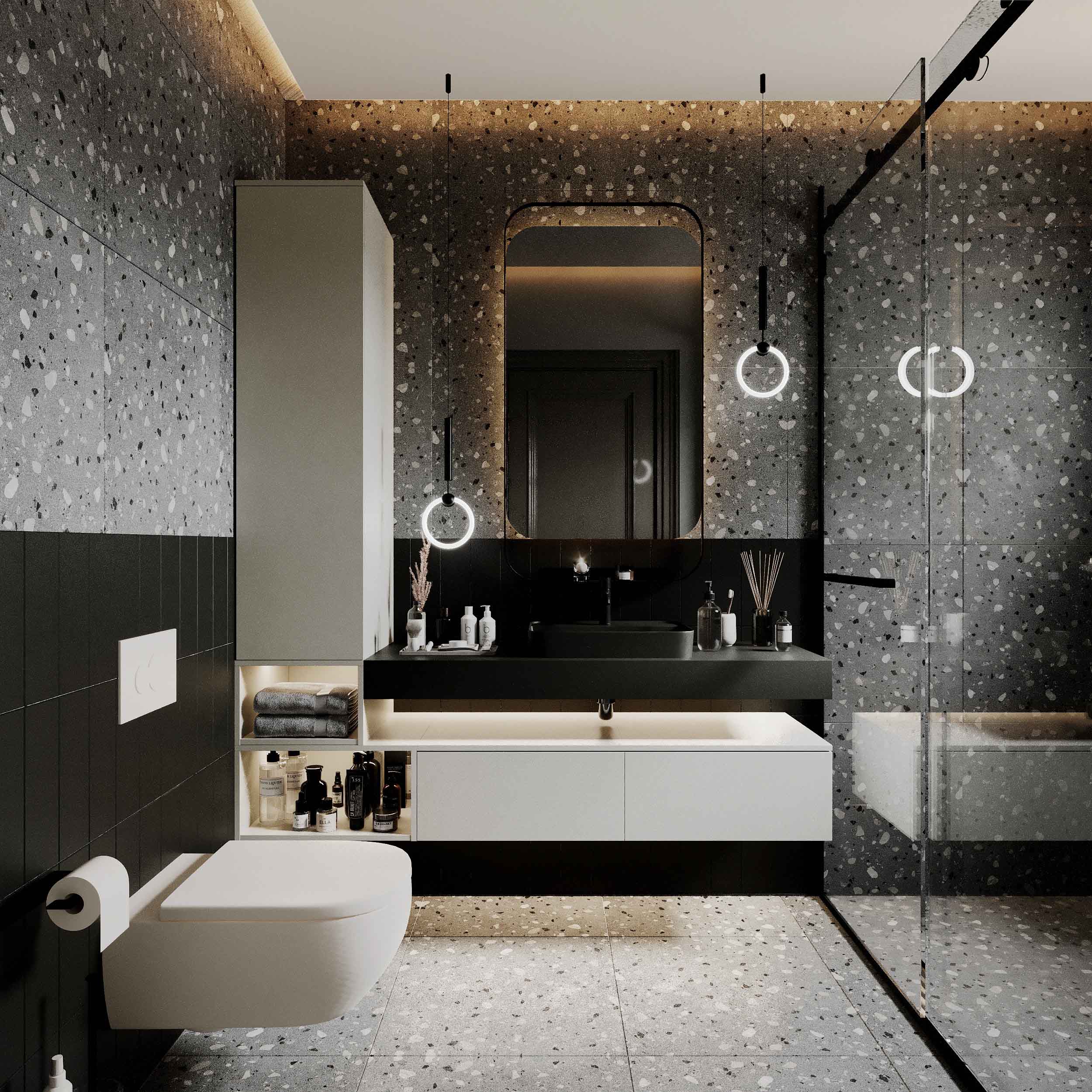 Aydınlatma tasarımı, banyonun işlevini vurgular. Aynaların etrafındaki aydınlatma, yüz bakımını kolaylaştırırken, genel aydınlatma da ferah bir atmosfer oluşturur.