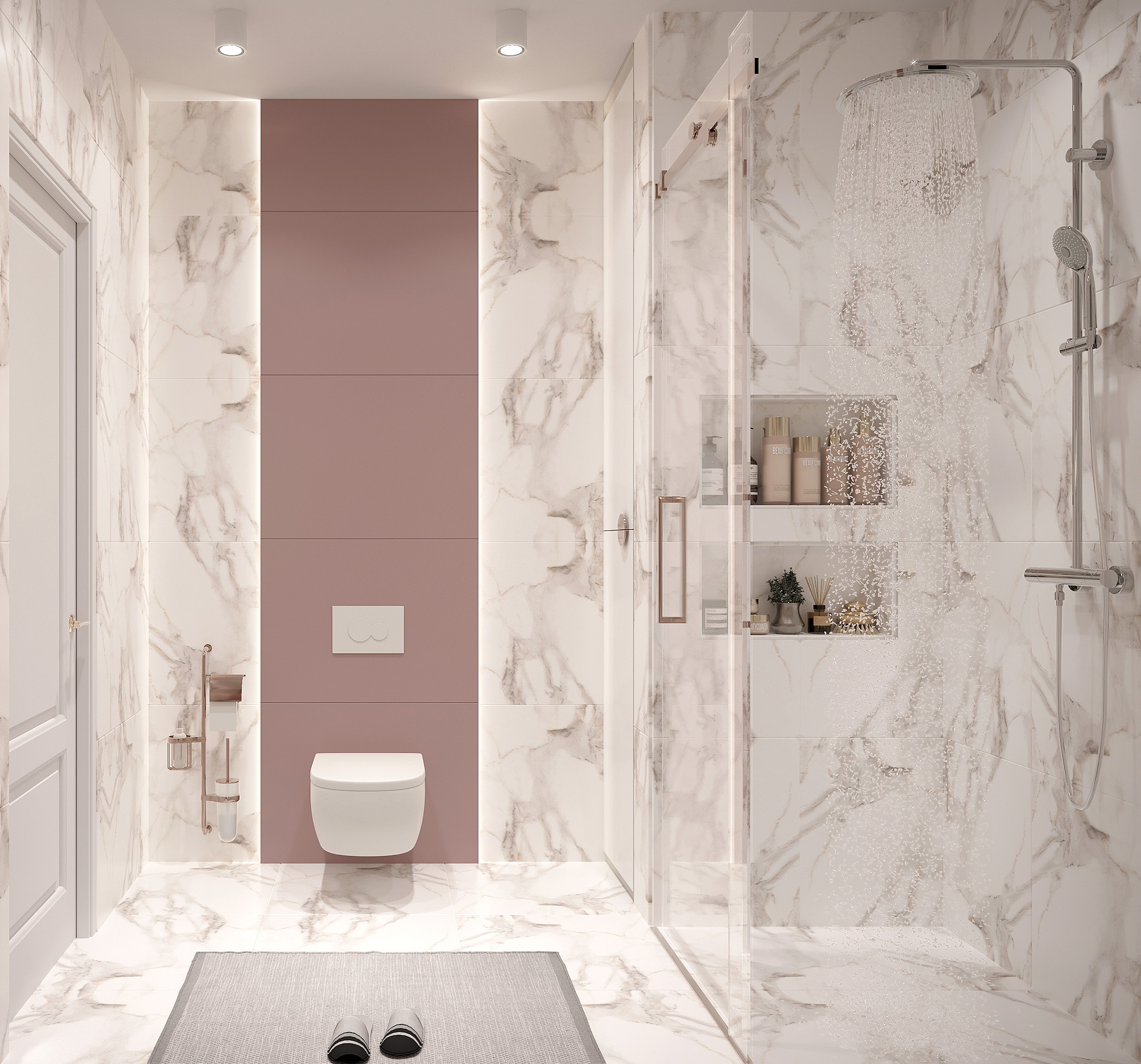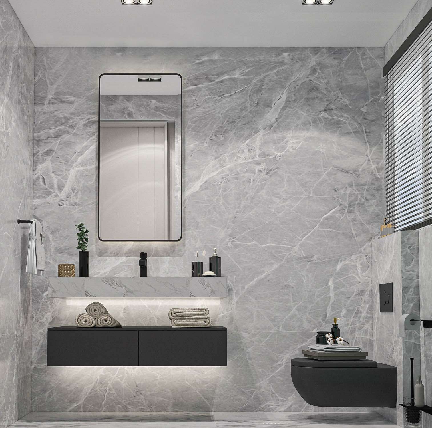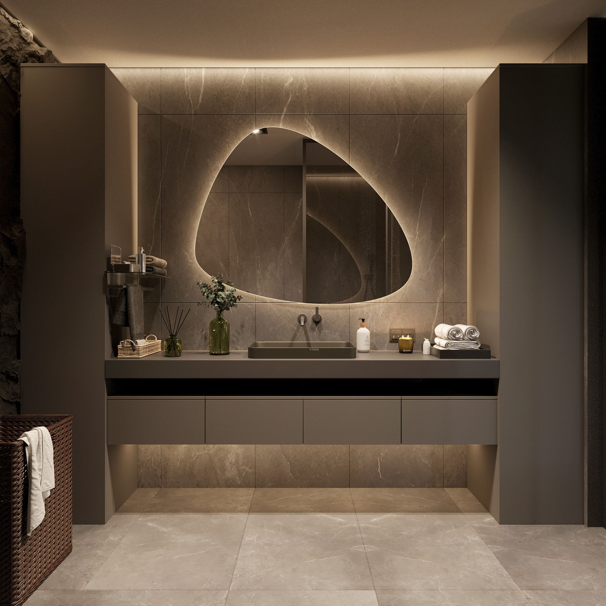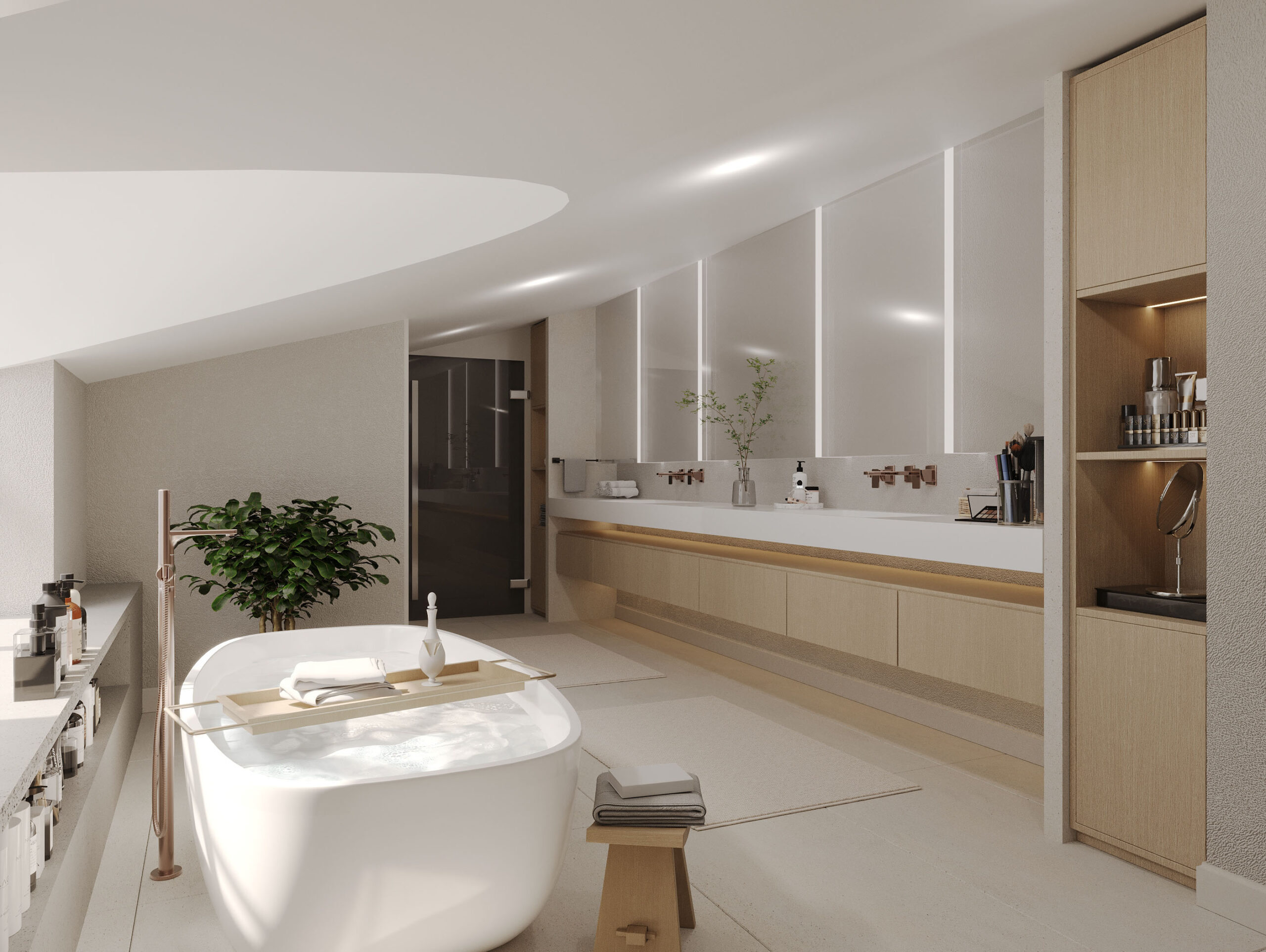 Aydınlatma tasarımı, banyonun işlevini vurgular. Aynaların etrafındaki aydınlatma, yüz bakımını kolaylaştırırken, genel aydınlatma da ferah bir atmosfer oluşturur.